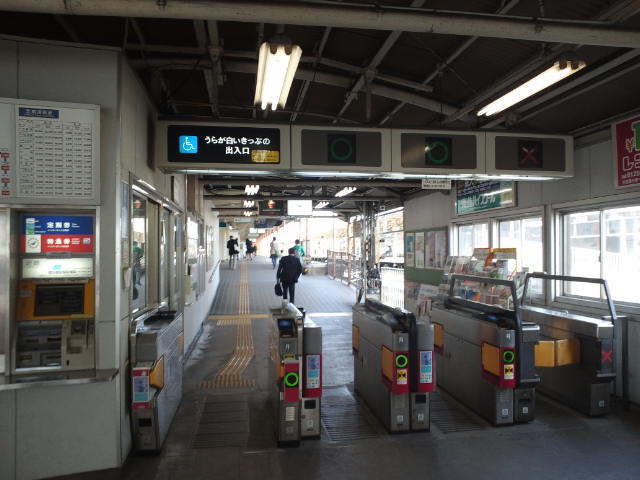 改札。上下線の駅舎が踏切を挟んで分離しているため、入場には注意が必要です。 |